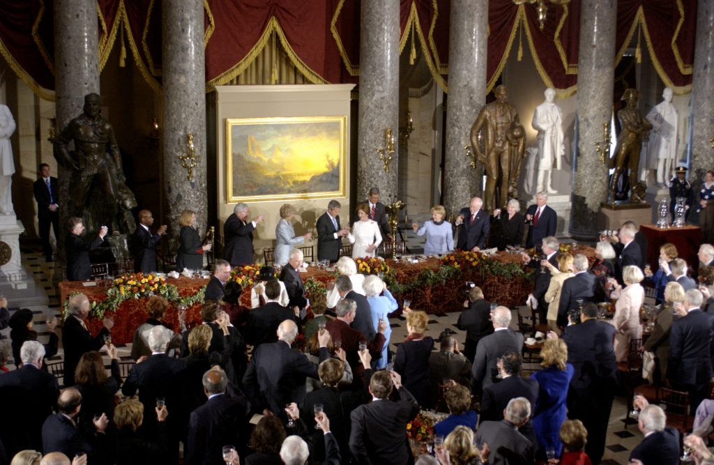 Members of the Joint Congressional Committee on Inaugural Ceremonies hosted a luncheon in honor of the newly sworn-in President and Vice President. Approximately 200 guests including the new President, Vice President, members of their families, the Supreme Court, Cabinet designees, and members of Congressional leadership attended the event in the Capitol’s National Statuary Hall.
